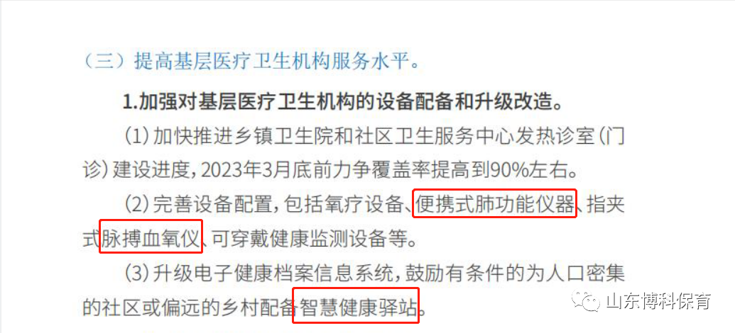 國(guó)家衛(wèi)健委出臺(tái)《新冠重點(diǎn)人群健康服務(wù)工作方案》,方案提及基層醫(yī)療衛(wèi)生機(jī)構(gòu)要完善設(shè)備配置,包括氧療設(shè)備、便攜式肺功能儀器、指夾式脈搏血氧儀、可穿戴健康監(jiān)測(cè)設(shè)備等。