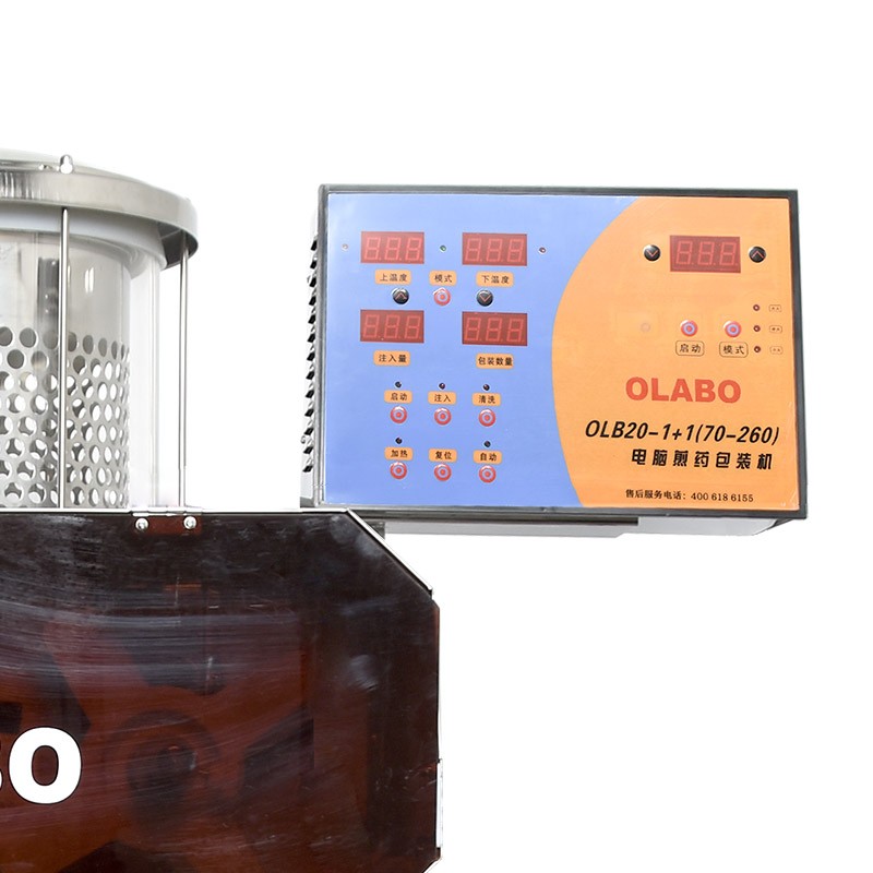 本機充分考慮了煎煮過程中對火候、先煎后下等功能的要求,設計了加熱煎煮、大、中、小四個火候任意轉換;包裝方式自動灌裝、封口、剪袋一次完成,單片機自動控制(微電腦自動控制)獨立工作;具有防干燒功能。具有定時設定控制功能,控制精度更高。包裝溫度、包裝量自動顯示。封合溫度數字化控制,可以設定自動恒定。藥液加熱控制及濃縮功能。
