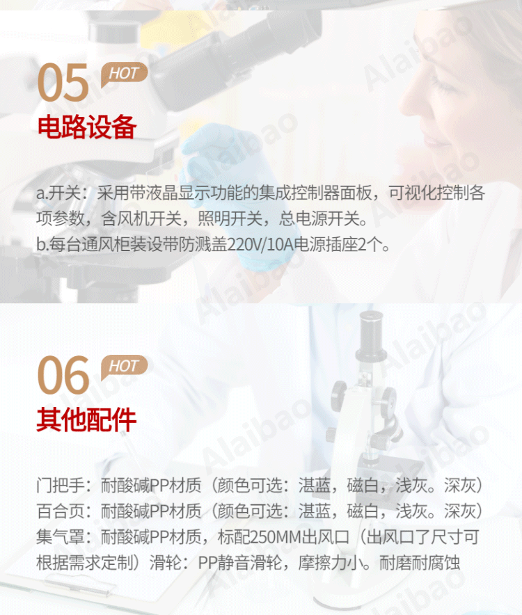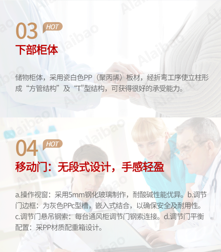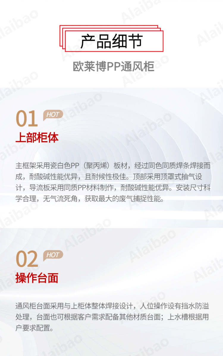 采用瓷白色PP(聚丙烯)板材,厚度8MM 折彎加厚防溢設計??蛇x配實芯理化板臺面、環氧樹脂臺面或陶瓷臺面等。